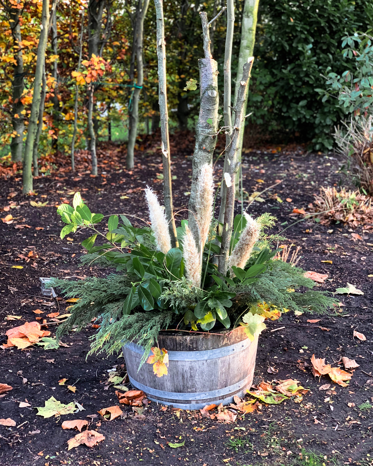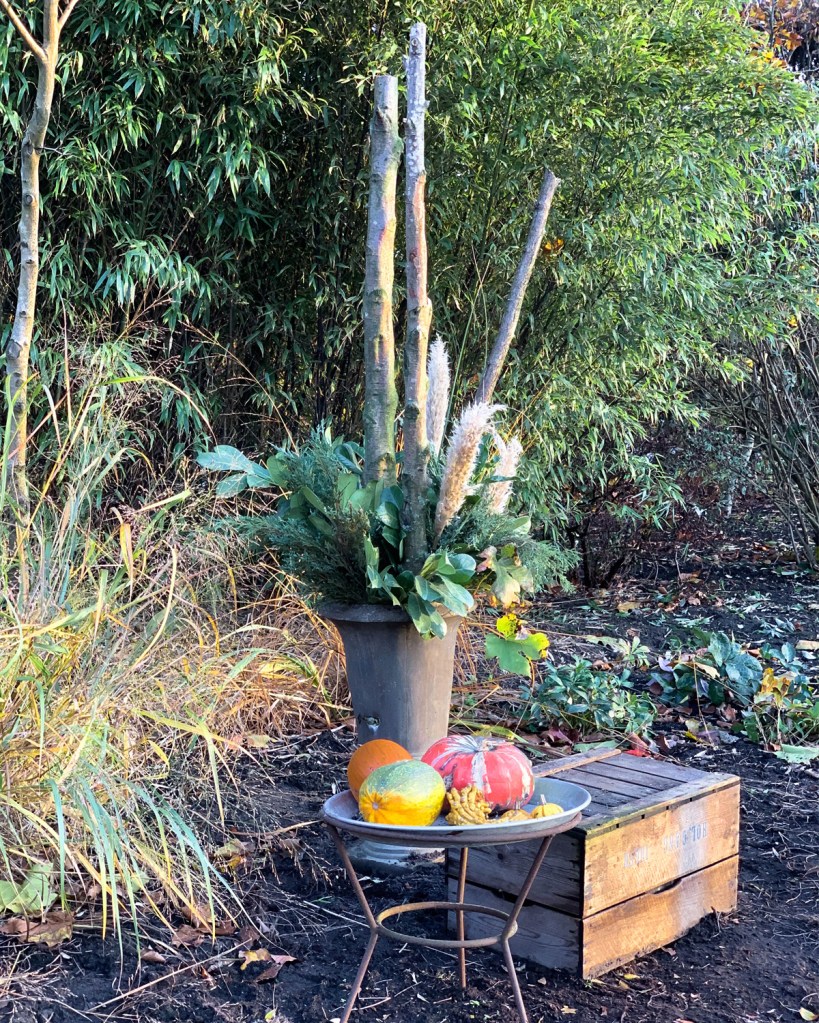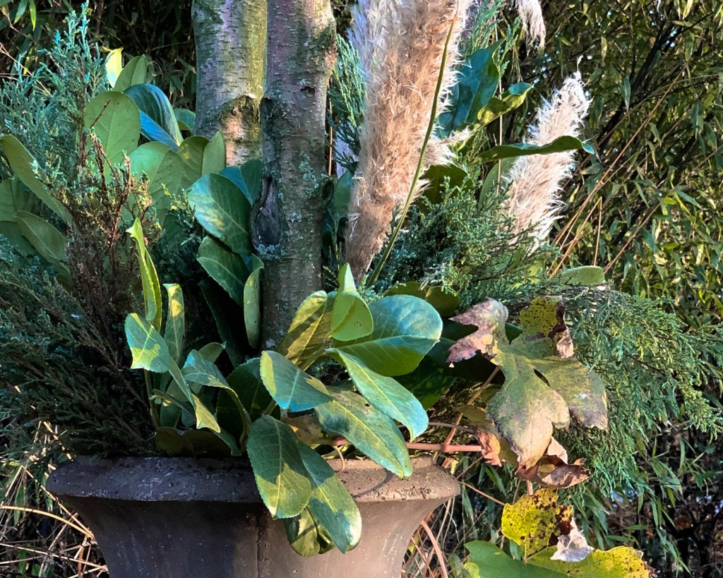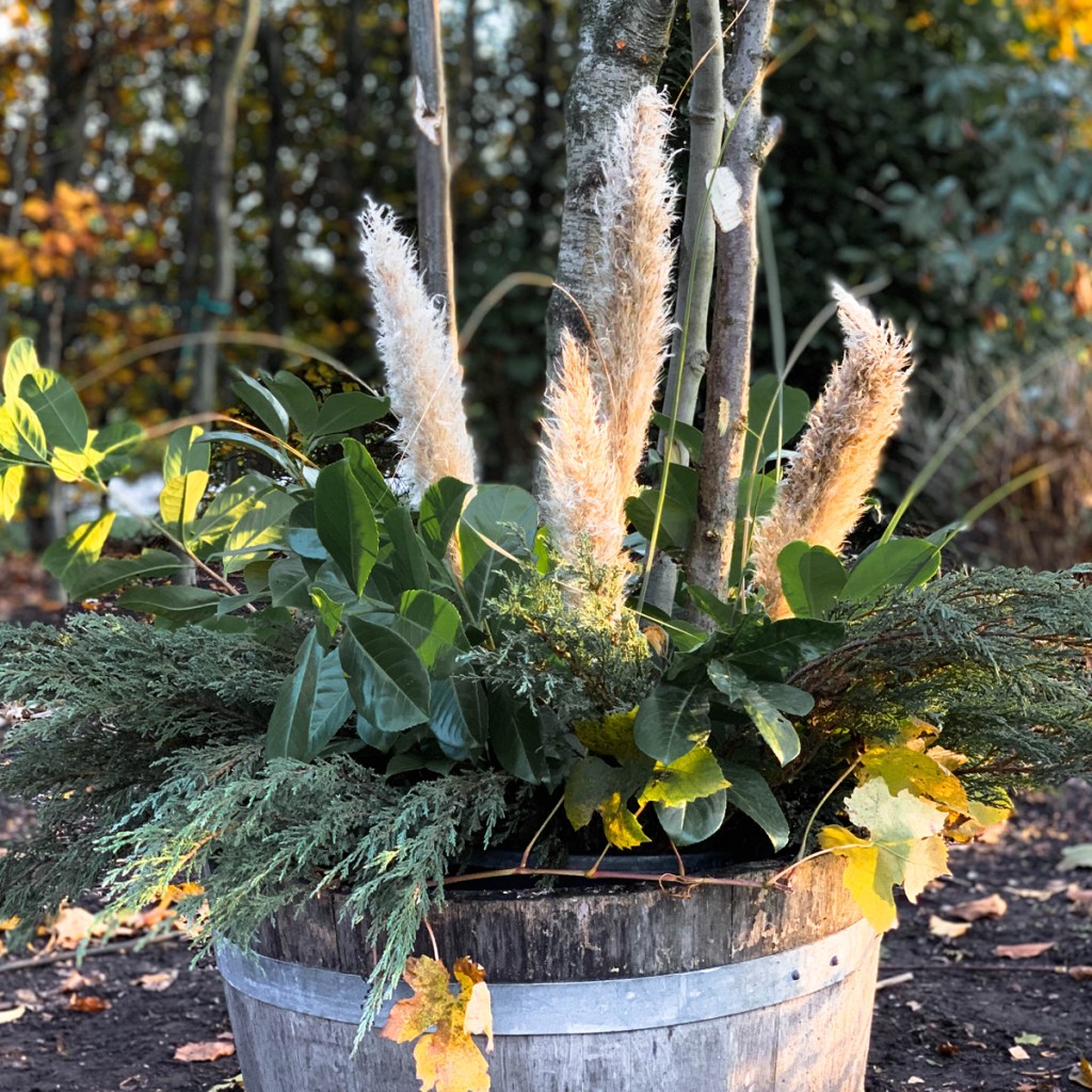 Droogbloemen zijn dit jaar helemaal hip. Heeft u pampasgras(Cortaderia) in de tuin, gebruik deze dan in combinatie met andere groene takken. Dit geeft een zachter maar zeker ook winterse uitstraling. Een hulst met rode besjes maken de winterlook compleet. Heeft u deze niet in uw tuin, gebruik dan andere takken met rood/oranje gekleurde bladeren, zo creëert u kleur variatie in uw creatie.